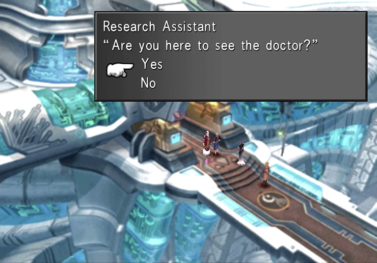เราสามารถกลับไปดูรายละเอียดแผนที่เมือง Esthar ในหน้าก่อนหน้าได้ แต่การหา Laboratory นั้นค่อนข้างง่าย เมื่อเราเข้าสู่ Esthar ครั้งแรก ให้ขึ้นบันไดไปยังหน้าจอถัดไป แล้วมุ่งหน้าไปทางซ้ายตรง ๆ สองครั้ง เราสามารถใช้แท่นลอยน้ำเพื่อไปยังที่นั่นโดยตรงได้ แจ้ง Research Assistant ที่ยืนอยู่ด้านหน้าว่าเรามาพบคุณหมอ