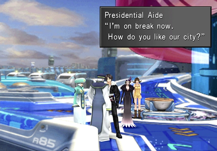 มุ่งหน้าไปยัง พื้นที่ (3) ใกล้ Airstation และคุยกับชายที่สวมชุดคลุมสีขาวและน้ำเงินที่กำลังคุยกับผู้หญิงคนหนึ่ง (Presidential Aide) สิ่งที่เขาจะพูดคือ “I’m on break now. How do you like our city?” (ตอนนี้ผมพักอยู่ คุณชอบเมืองของเราไหม) แต่เราต้องคุยกับเขาเป็นเงื่อนไขก่อนที่จะสามารถทำขั้นตอนถัดไปได้