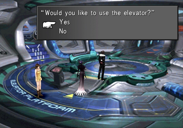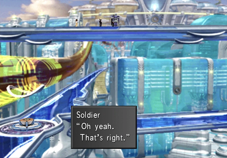 เมื่อไปถึง ให้คุยกับ Esthar Soldier ที่ยืนอยู่ที่นั่นอย่างไม่สนใจ สิ่งที่ทหารจะพูดคือ “Oh yeah. That’s right.” (อ๋อ ใช่ ถูกแล้ว) ถือว่าเสร็จสิ้นในส่วนนี้