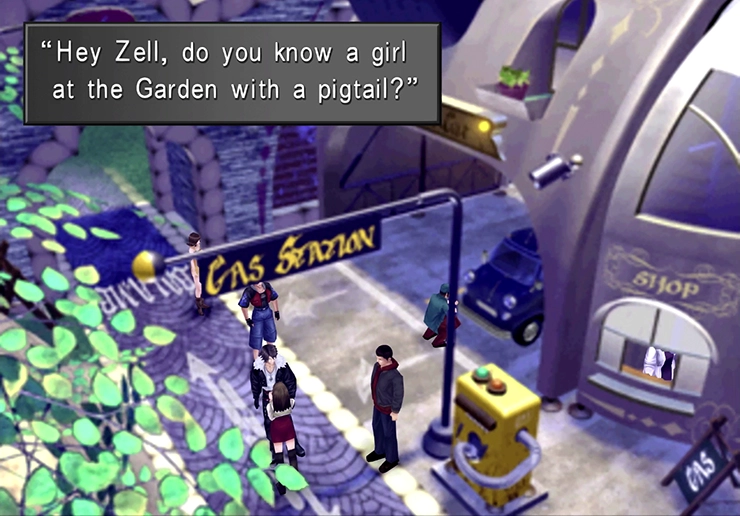 เมื่อเราเข้าสู่ Balamb จะมีผู้หญิงคนหนึ่งเดินผ่านไปในหน้าจอแรกสุด ภายใต้ป้าย Gas Station (ตามที่แสดงในภาพหน้าจอ)