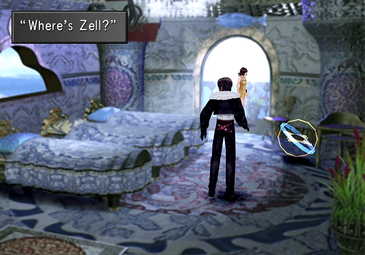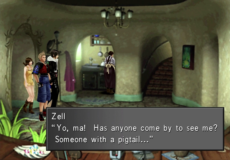 คุยกับผู้หญิงคนนั้น แล้วเธอจะกล่าวถึง Zell ว่ามี ผู้หญิงผมเปีย แวะมาที่บ้านของเขา ตอนนี้ เดินลงไปที่ บ้านของ Zell เพื่อคุยกับแม่ของเขาอย่างรวดเร็ว ซึ่งแม่ของเขาจะบอกเขาว่าไม่มีผู้หญิงคนดังกล่าวแวะมาที่บ้านของพวกเขาเลย
