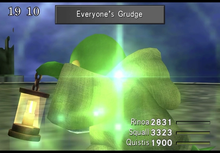 ศัตรู Tonberry มีการโจมตีอันตรายสองแบบ การโจมตีแรกเรียกว่า “Everyone’s Grudge” (ความอาฆาตของทุกคน) สูตรคำนวณความเสียหายของการโจมตีนี้คือ: จำนวนศัตรูที่ตัวละครที่ถูกโจมตีได้กำจัดไป คูณด้วย 20 ดังนั้น หาก Squall เป็นคนสังหารมอนสเตอร์ไป 100 ตัว การโจมตี “Everyone’s Grudge” จะสร้างความเสียหายแก่เขา 2,000 หน่วย