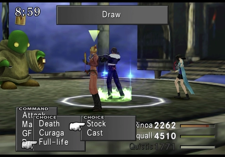 Tonberry King มีเวทมนตร์ที่ทรงพลังบางอย่างที่เราควรพิจารณา Draw ในขณะที่เราสามารถทำได้ เขาครอบครองเวทมนตร์ทั้ง Curaga และ Full-Life ซึ่งเราอาจจะยัง Draw ไม่เต็มจำนวน และทั้งสองมีประโยชน์มากเมื่อนำไป Junction กับค่าสถิติการป้องกันของตัวละคร