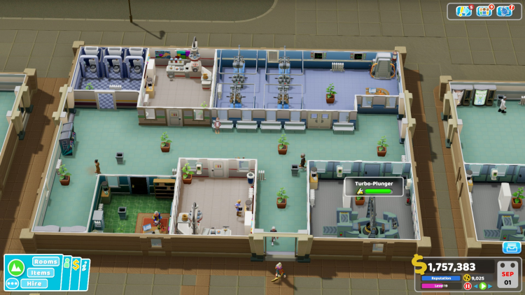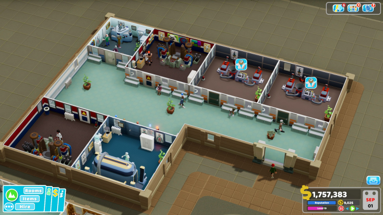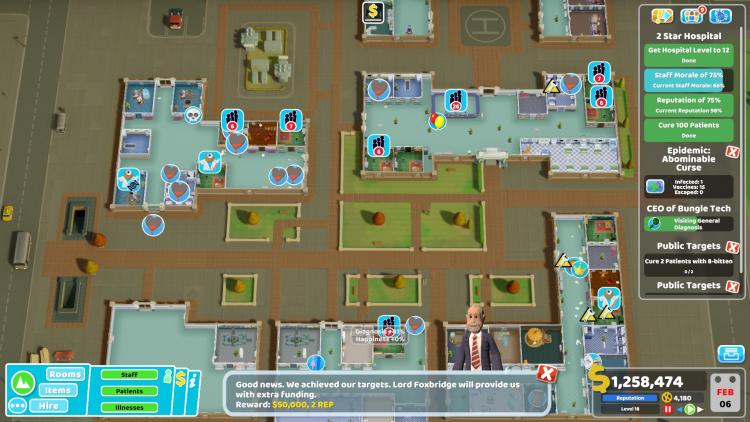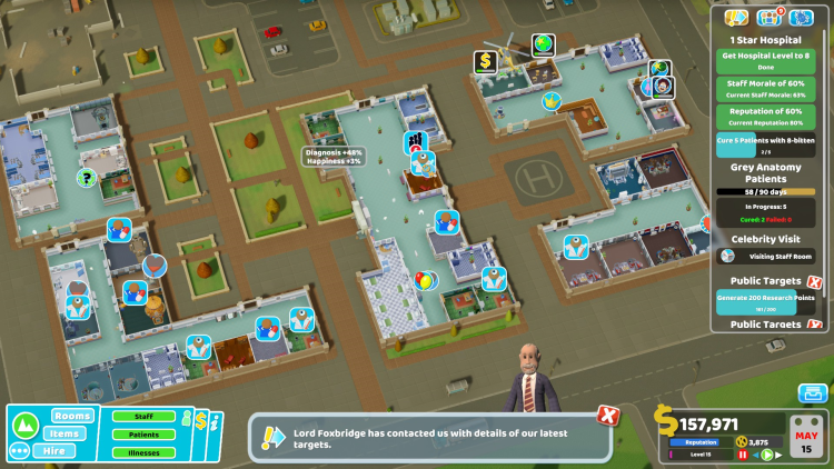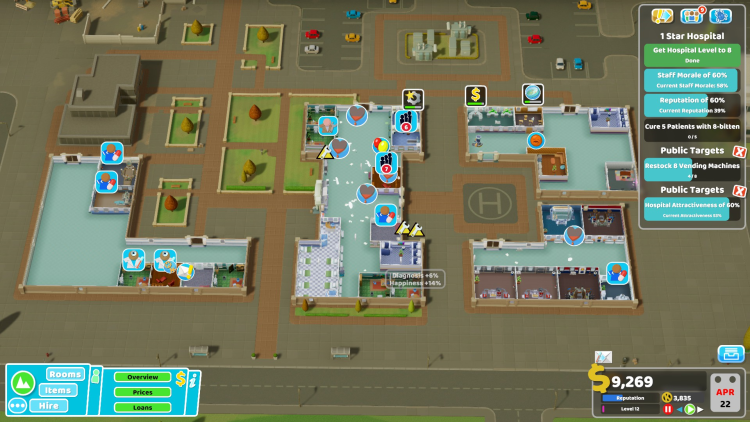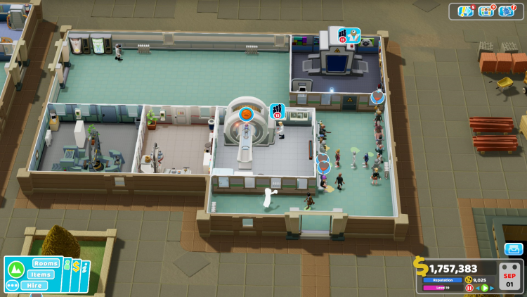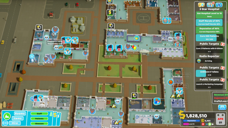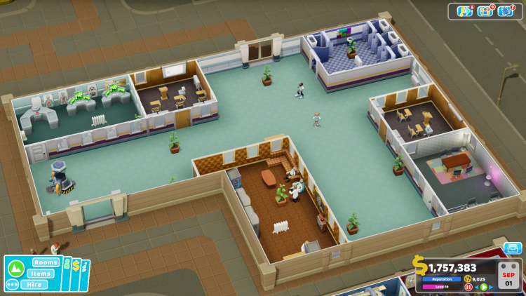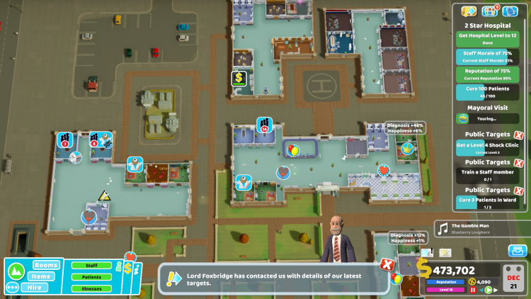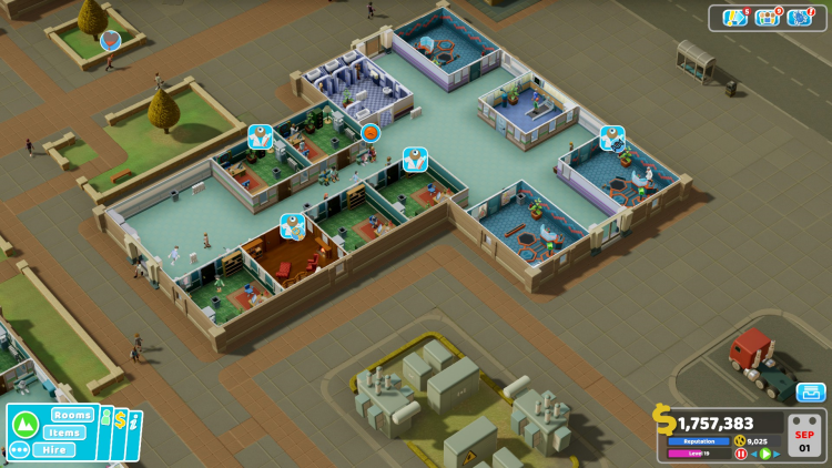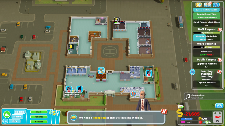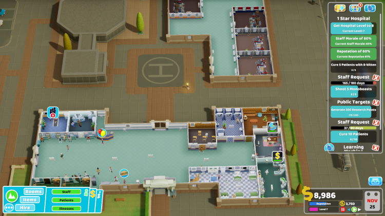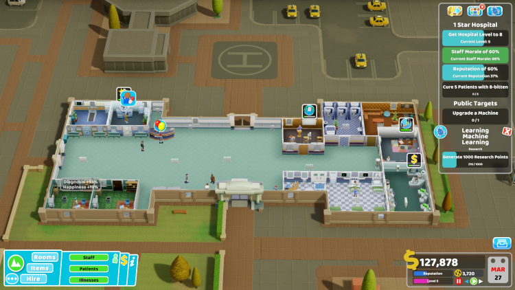 - Marketing Room (ห้องการตลาด): เป็นห้องใหม่ที่สำคัญในด่านนี้ ใช้เพื่อโปรโมตโรงพยาบาล ดึงดูดผู้ป่วย และรับสมัครพนักงาน