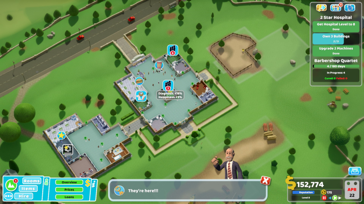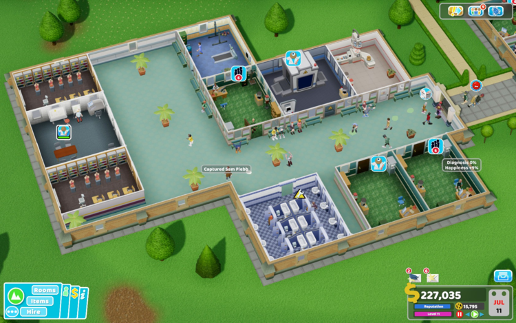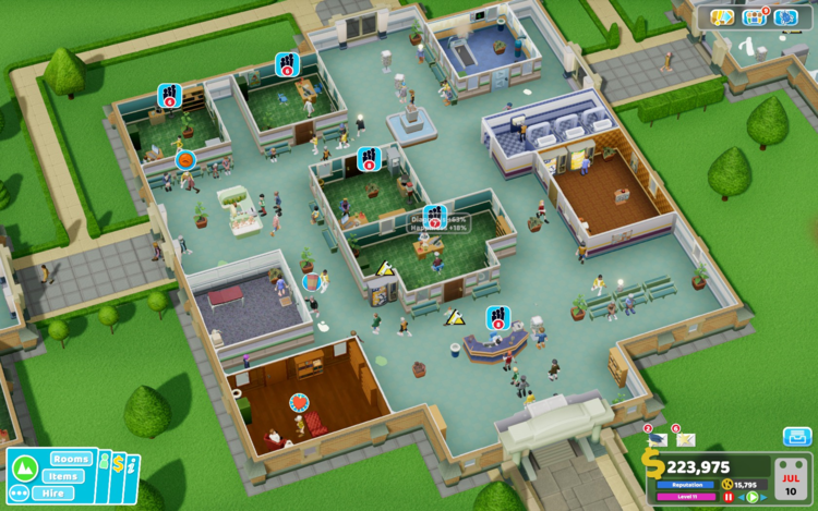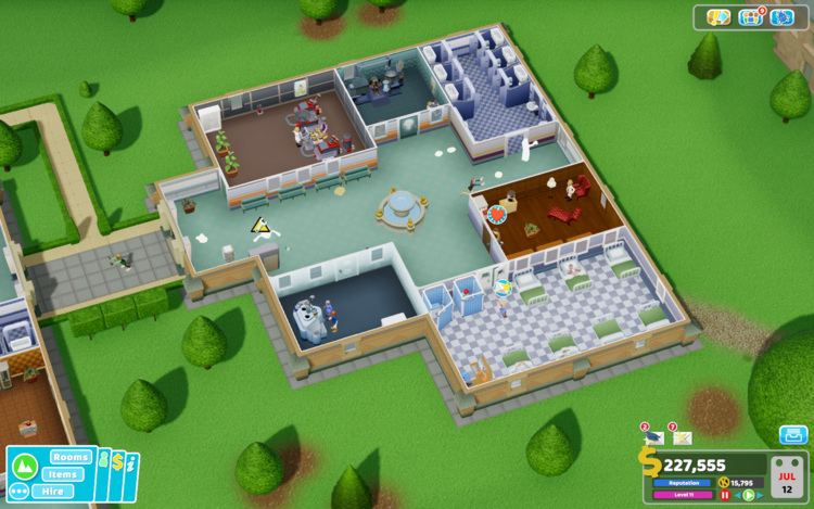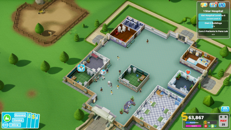 - เพิ่มระดับโรงพยาบาล (Hospital Level) (จำนวนที่กำหนด): ซึ่งทำได้โดยการสร้างห้องเพิ่ม, จ้างพนักงานมากขึ้น, และโปรโมตพนักงาน