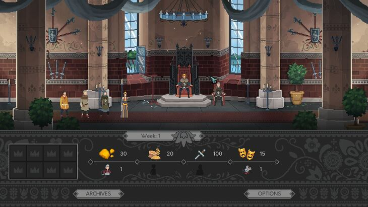 ตอนนี้เราสามารถคลิกที่ปุ่มรูปดอกไม้ข้างตัวระบุสัปดาห์เพื่อจบสัปดาห์ ซึ่งจะพาเราไปยังหน้าจอใหม่ ในหน้านั้นเราจะเห็นสองส่วน ส่วนท้องพระคลังจะแสดงสถานะทั้งหมดที่กำลังดำเนินอยู่ในปัจจุบัน เมื่อเริ่มเกม เราจะเก็บภาษีได้เพียงเล็กน้อย แต่ก็มีโรงละครที่พัง หลังคาห้องเก็บอาหารที่ชำรุด และต้องจ่ายเงินให้เหล่าเจ้าหน้าที่ (Agents)