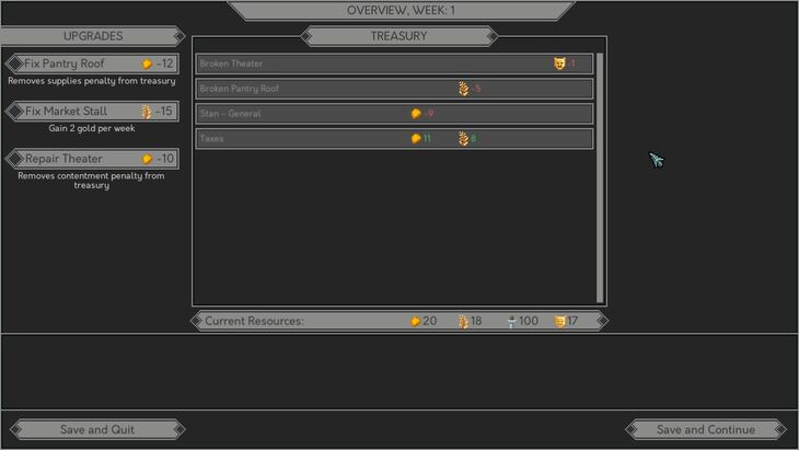 ส่วนอัปเกรดจะช่วยให้เราซ่อมแซมสิ่งของที่ชำรุดเพื่อหยุดการสูญเสียทรัพยากร แต่ต้องแลกกับค่าใช้จ่าย ในตอนนี้เราควรมี 20 ทอง, 18 เสบียง, 100 ทหาร และ 17 ความพึงพอใจ การสูญเสียเสบียง 5 หน่วยจะส่งผลกระทบมากถ้าเราไม่รีบจัดการ ดังนั้นให้เลือกซ่อมหลังคาห้องเก็บอาหาร (Pantry Roof) เพื่อกำจัดปัญหานี้ การซ่อมแผงขายของในตลาด (Market Stall) ก็มีประโยชน์เช่นกันเพราะจะให้ทองเพิ่ม 2 หน่วยต่อสัปดาห์ เราเลือกทำเช่นนั้นด้วย เพราะเราเพิ่มความพึงพอใจได้ถึง 3 หน่วย ขณะที่โรงละครลดไปเพียง 1 เราจึงยังมีความพึงพอใจรวมเพิ่มขึ้น 2 หน่วย ดังนั้นเราสามารถปล่อยการซ่อมโรงละครเอาไว้ทีหลังได้ ตอนนี้ให้บันทึกเกมแล้วไปต่อสัปดาห์ถัดไป