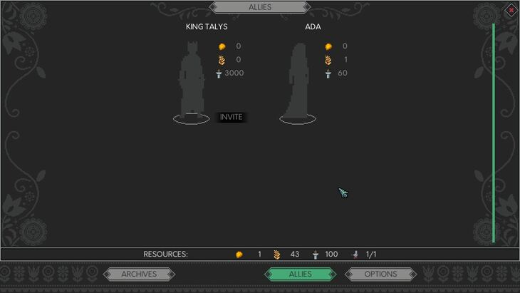 จากนั้นคุยกับ Audry เขาได้แต่งตั้งหน่วยสอดแนมและแนะนำให้เชิญกษัตริย์ Talys มาหารือเกี่ยวกับปัญหาของคุณ สิ่งนี้จะเปิดแถบ “Allies” (พันธมิตร) ดังภาพด้านล่าง