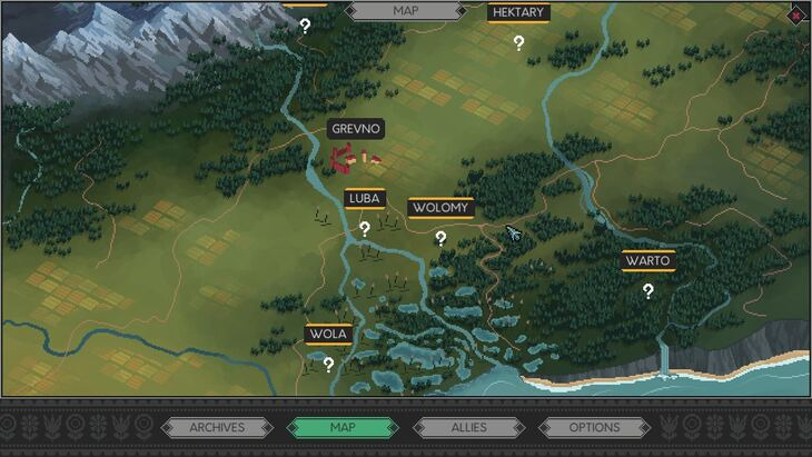 เริ่มแรก นายพลของเราจะออกมา ปรากฏว่าพวก Radovian ได้ตั้งค่ายใกล้กับปราสาทของเราเพื่อเตรียมพร้อมสำหรับการโจมตี มันจะเป็นการดีหากเราทำลายค่ายเหล่านั้น ดังนั้นให้เปิดส่วน “แผนที่” (Map) ใหม่และส่งนายพลไปยังจุดประจำการใดก็ได้โดยการคลิกที่จุดนั้น เราเลือกจุดประจำการตะวันตก (West Post) เพื่อใช้เป็นจุดอ้างอิง บันทึก “Radovian Bite” จะได้รับการอัปเดต